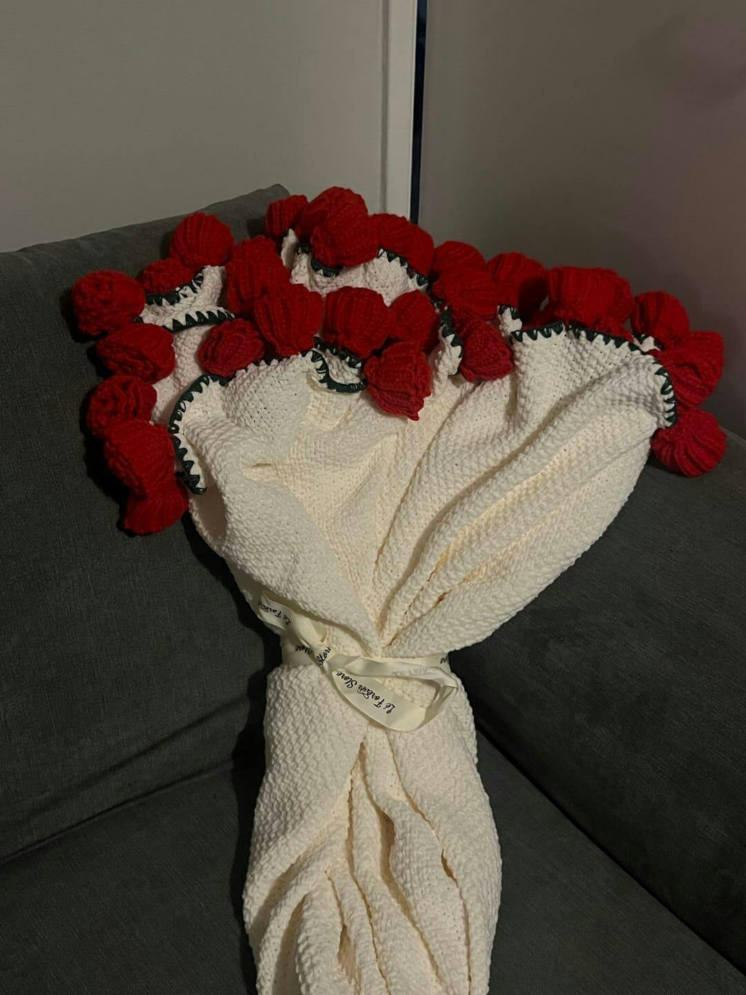 Notre double savoir-faire associe le tricot fait main à des fleurs crochetées au réalisme saisissant, pour créer un bouquet à la fois doux, réconfortant et spectaculaire.